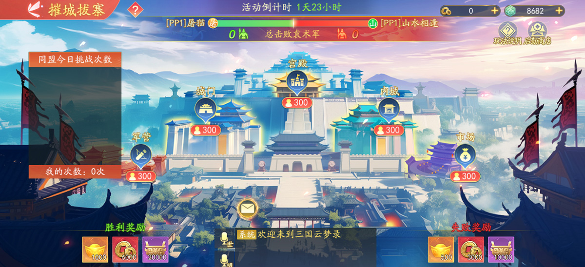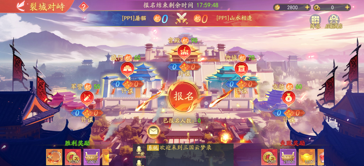 1.系统将根据阶段一排名自动匹配两个同盟组成联军,双方协力攻打目标城池。城池内包含5个区域,小将军可以自由选择任一区域参与,可随时切换区域。