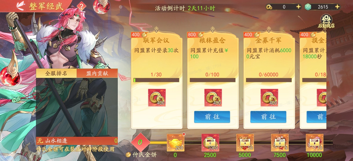 2.同盟贡献可激活联盟进度节点奖励,包含元宝、玩法专属货币、限时招募券等丰富奖励。
